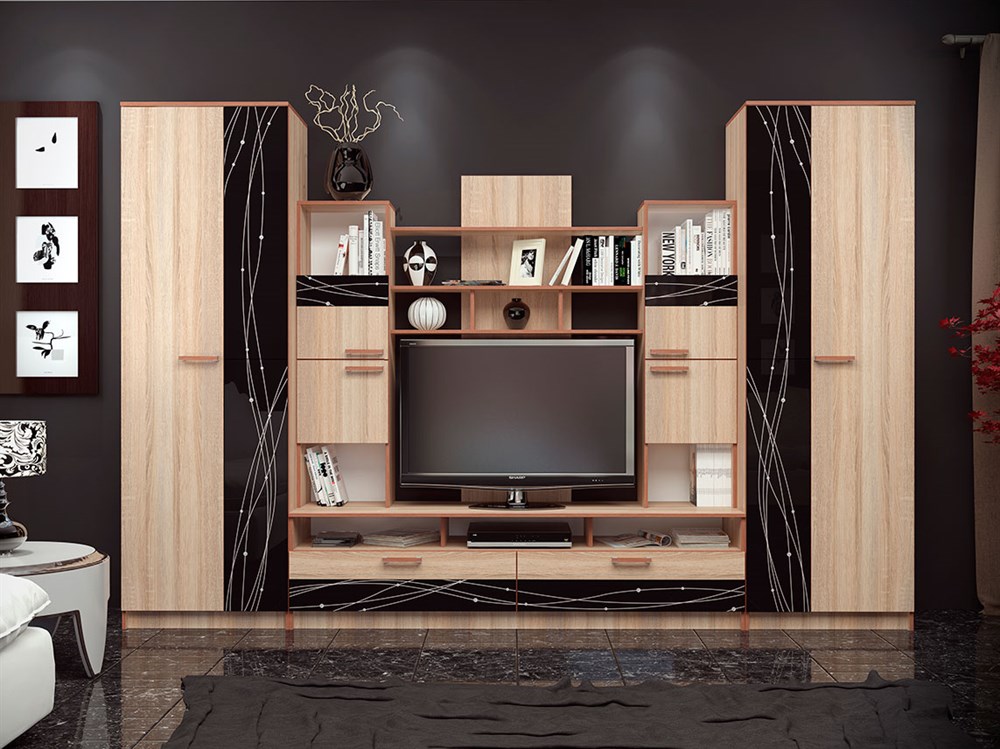Грациозная и функциональная гостиная изготовлена из самого модного декора этого сезона «дуб сонома» – трёхмерная текстура с заметными следами распила. Характерными деталями являются сочетание светлых и темных пор (эффект теней), сердцевидные лучи и поперечные следы пилы. Декоративные элементы на створках выполнены из стекла с двумя вариантами оформления. «Кашемир» – это нежные контрастные линии, а «каштан» – это флористичный принт. Одна эта деталь кардинально меняет общий вид гостиной, подчеркивая индивидуальный стиль обладателя.