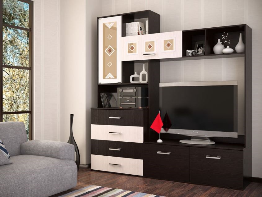 Модульная гостиная «Белла» - это функциональная и лаконичная мебель, контрастные тона, стилизованный декор, сочетающий в себе простые геометрические формы, придающие любому помещению уют и тепло.