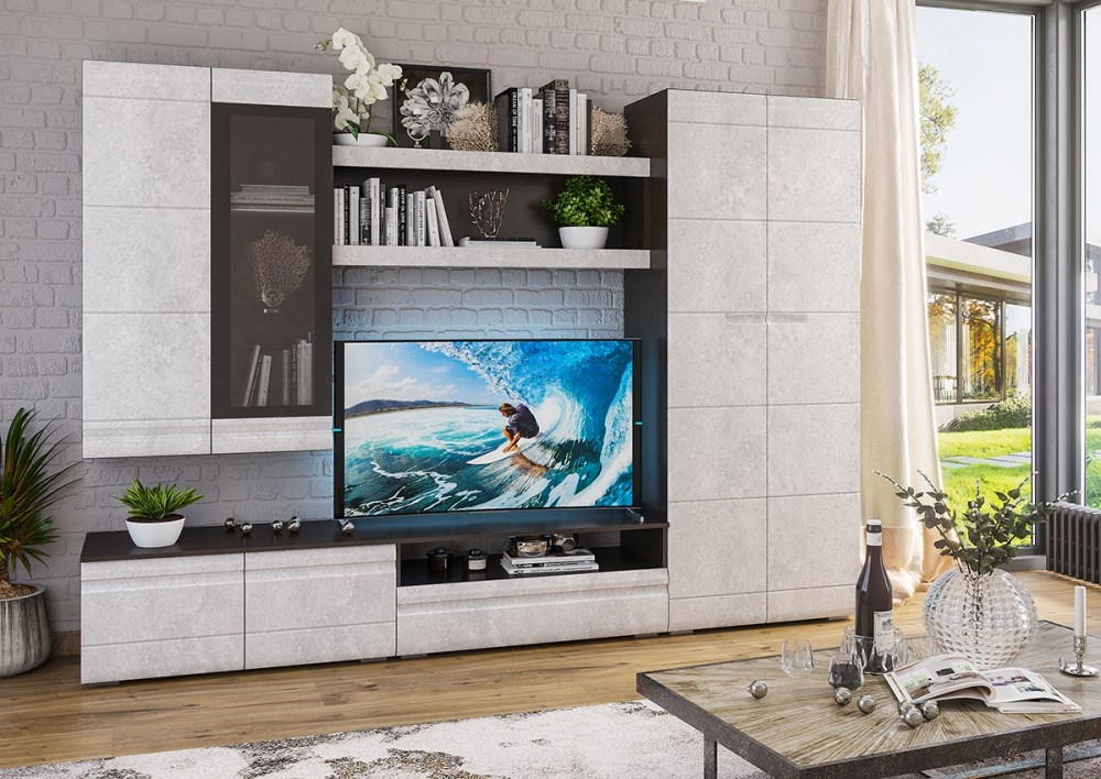 Стенка "Бруклин-1" подойдет для создания гостиной в стиле лофт или минимализм.