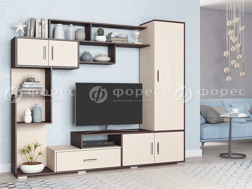 Компактная гостиная с полками и боковым вертикальным шкафом. Оптимальный выбор для квартиры-студии.