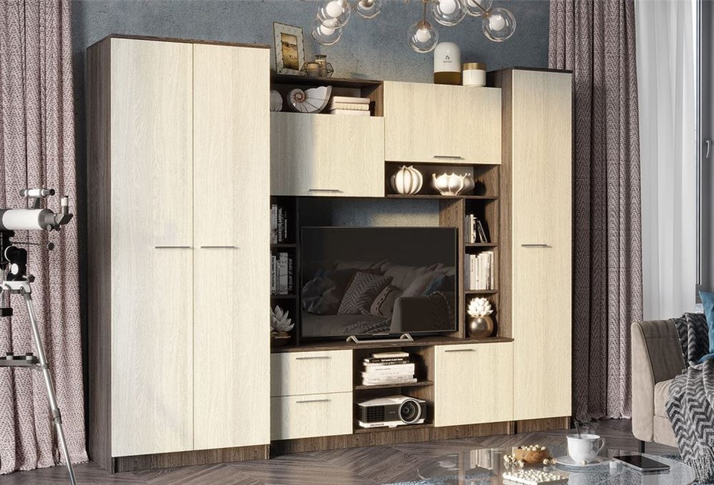 Гостиная содержит центральную секцию под ТВ с обилием открытых полок, вместительный шкаф со штангой и пенал с полками для одежды, а так же удобные ящики и дополнительные секции под необходимые вещи. Зеркала не входят в комплект гостиной, их вы можете приобрести отдельно.