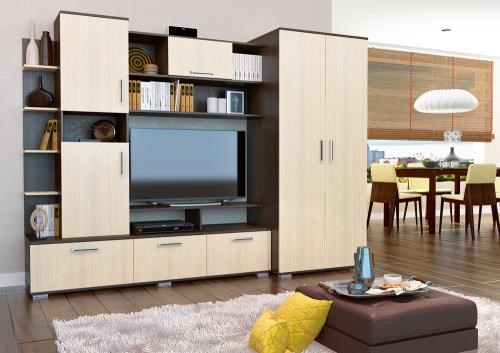 Гостиная КАИР - это множество удобных ниш и полок, а также полноценный платяной шкаф.