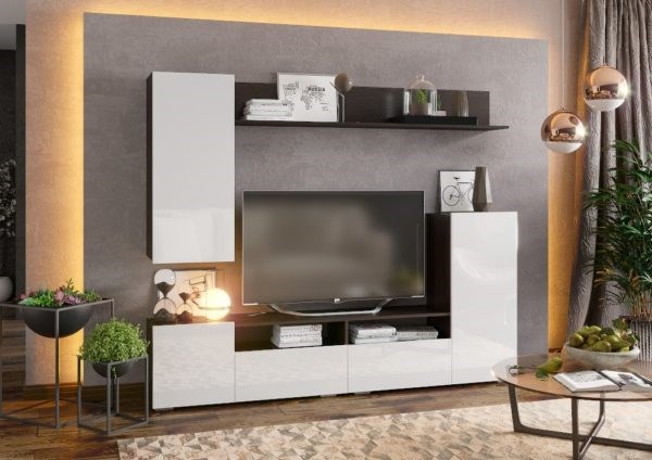 Стенка включает в себя нишу под ТВ с открытыми и закрытыми полками для размещения приставок, медиа устройств, книг и элементов декора.