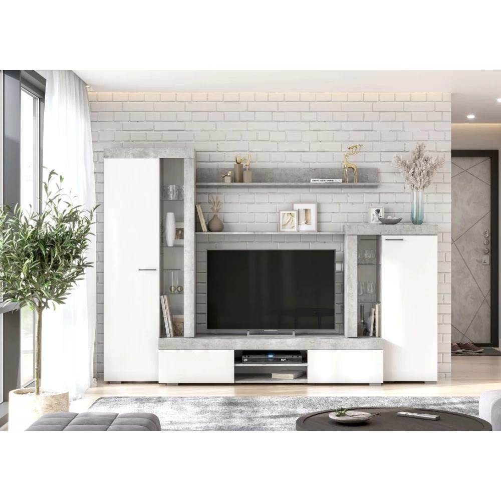 - Тумба гостиной имеет два отсека для хранения с откидными створками по краям и открытую нишу со стационарной полкой посередине.