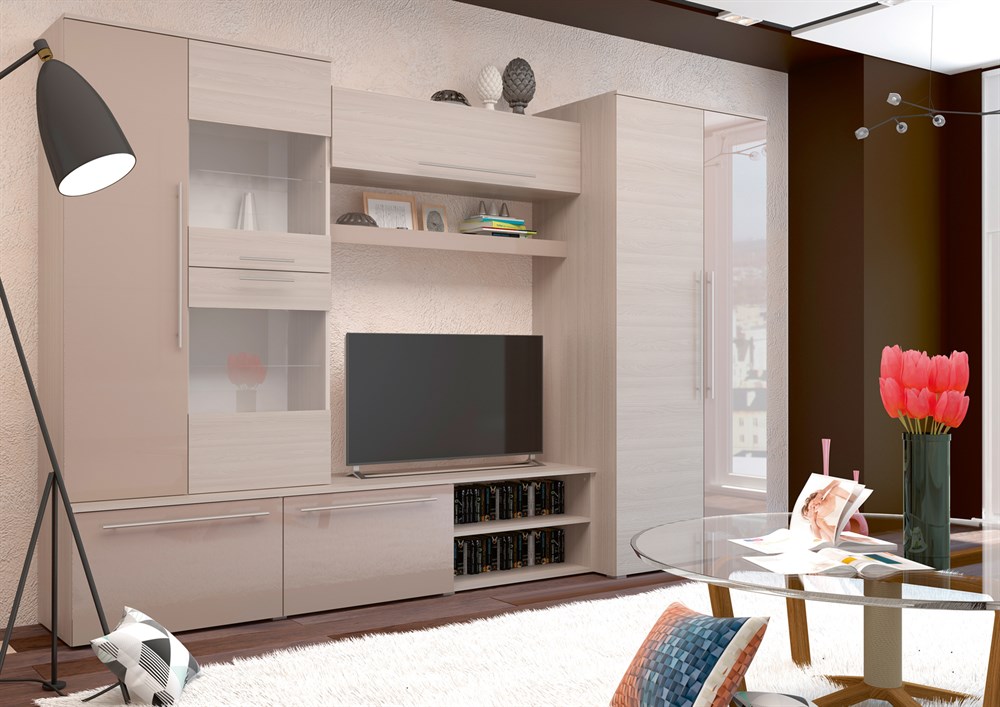 Гостиная МОНАКО с глянцевыми элементами на фасаде лаконично впишется в Ваш интерьер. Гармоничность форм подчеркивается чудесным выбором сочетающихся друг с другом цветов: глянцевая лакированная отделка цвета КАКАО и благородный ЯСЕНЬ шимо светлый.