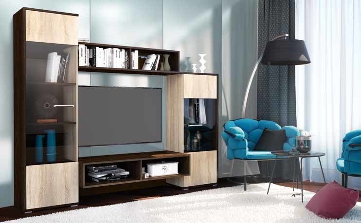 Гостиная КАИР - это множество удобных ниш и полок, а также полноценный платяной шкаф.