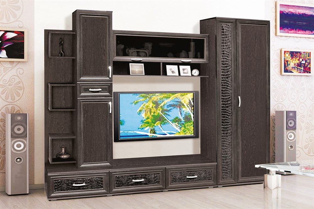 Гостиная "Вероника" изготовлена с применением экокожи Cayman темного или светлого цвета, имитирующей кожу рептилий, что непременно подчеркнёт благородство и элегантность Вашей комнаты.