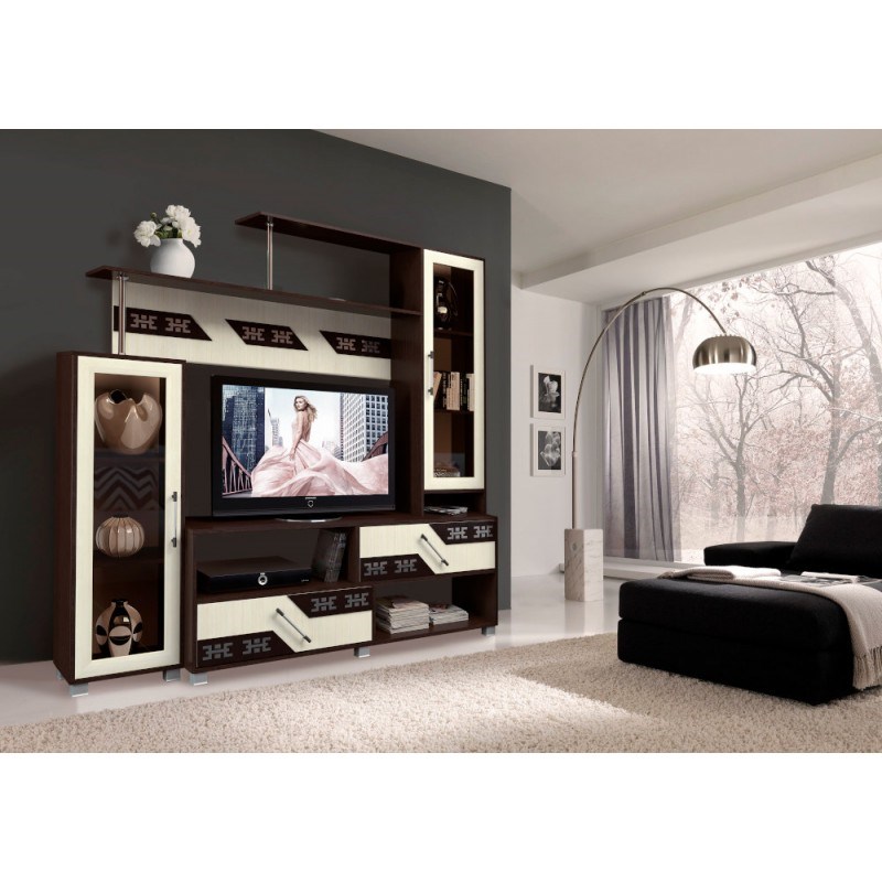 Сочетание темного корпуса и светлых деталей фасада выгодно подчеркивает ее неординарность. Тонированные стекла с модной отделкой, открытые полки для интерьерных аксессуаров, большое место под ТВ, вместительные шкафы делают данную модель функциональным, комфортным и стильным оформлением вашего дома.