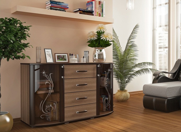 Комод «Грация» с изящным пескоструйным узором на гнутых стеклостворках мерцает благодаря стразам Swarovski. Он оснащен двумя вместительными отделениями по бокам за тонированной стеклостворкой, а в центральной части комода имеется четыре выдвижных ящика одинаковой вместимости.