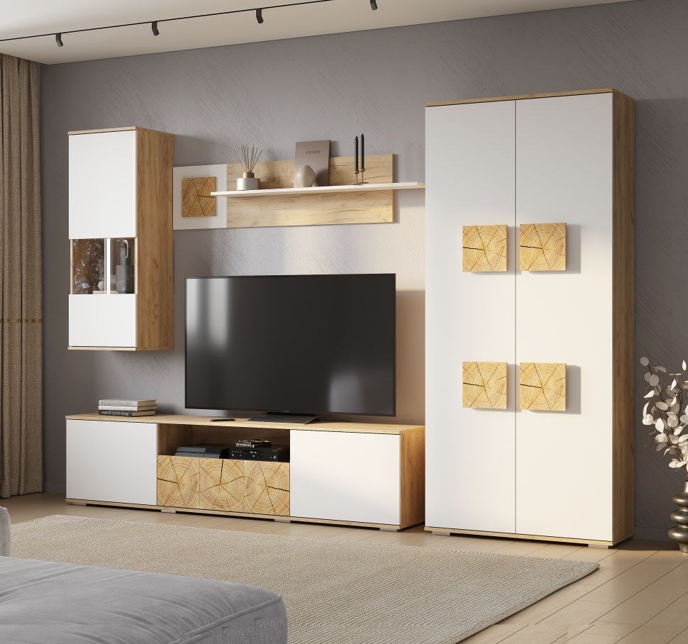 Шкаф-витрина оснащен стеклянными и деревянными полками, что позволяет хранить различные предметы — от посуды до книг. ТВ-тумба имеет открытые и закрытые полки и выдвижной ящик, что дает возможность разместить не только телевизор, но и другую мультимедийную технику, аксессуары и предметы декора. Навесные элементы добавляют в интерьер особую эстетику и функциональность.