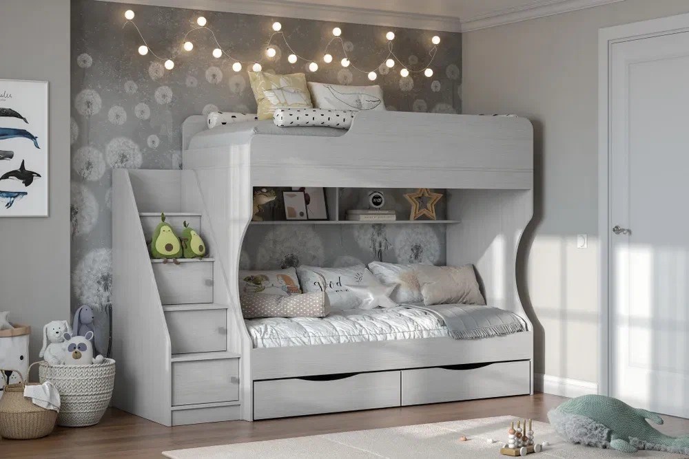 Кровать двухъярусная Каприз 22 с удобной лестницей. Кровать оснащена двумя выкатными ящиками. Лестница кровати по ступеньками имеет распашные дверцы.