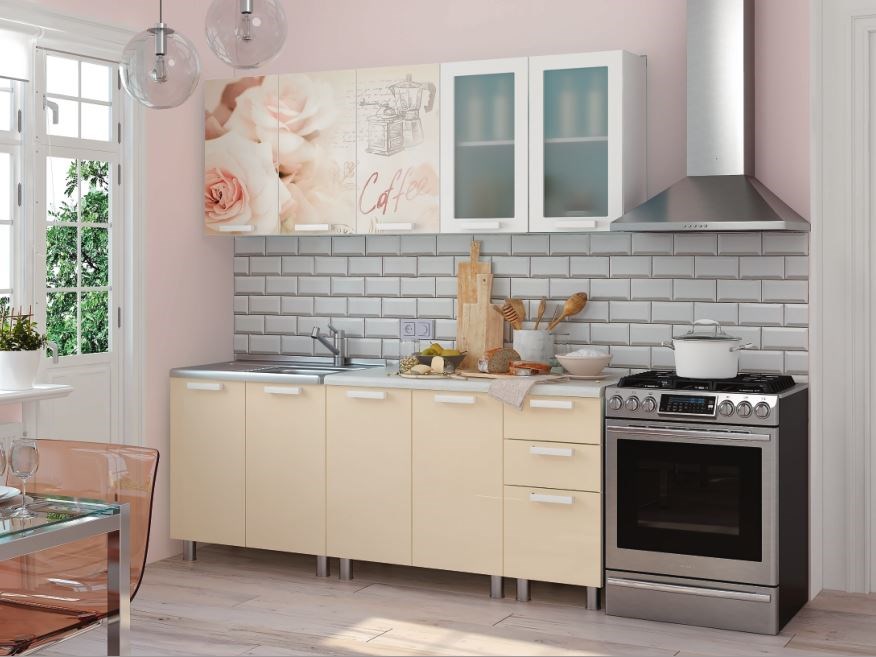 Выигрышная комбинация кремового цвета с декором в теплых тонах дарит легкость восприятия помещения и положительные эмоции его обладателям. Изображение, нанесенное на фасады кухни при помощи фотопечати, дает ощущение полноты жизни и счастливой беззаботности. Нежность розы дополняет атмосферу мягкостью.
