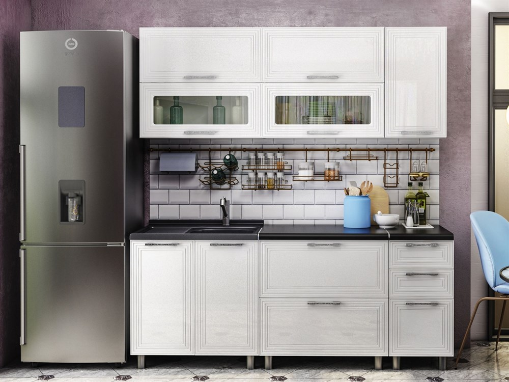 Кухонный гарнитур «Монро 2,0» комплектуется раздельной столешницей «Черный мрамор» толщиной 38мм на нижние модули 4Р3 и 8Р2.