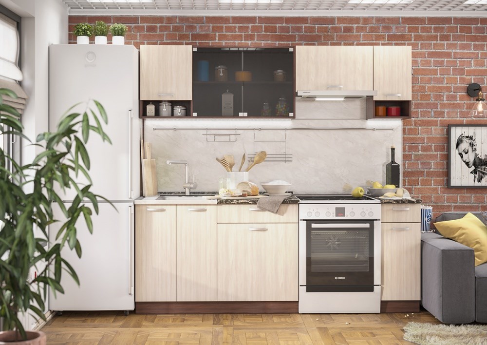 Кухонный гарнитур "Зара" - сочетание открытых и закрытых полок с темными тонированными стеклами, и стильной черной столешницей наполняет кухню особой атмосферностью