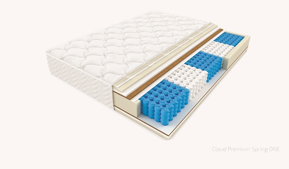 Матрас "Cloud Premium Spring ONE" - премиального уровня средней жёткости, на основе армированного независимого пружинного блока. В качестве слоя используются натуральная кокосовая плита, армированная умной плитой Forplit, и латексированной Ormofoam. Имеет активную боковую поддержку периметра. Трикотаж с рельефной стёжкой пропитан экстрактом Алое Вера - что позволяет продлить фазу глубокого сна и обеспечить максимальный релаксирующий эффект. Высота 27-28см. Нагрузка 140кг.