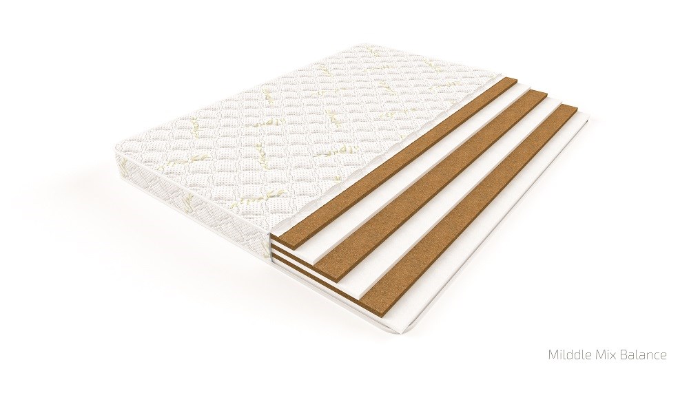 Матрас "Middle Mix Balance" - беспружинный матрас с разной жесткостью сторон на основе чередующихся слоев армирующиих умных Forplit и натуральных кокосовых плит. Одна сторона матраса – жесткая, другая - выше средней. Высота16-17 см. Нагрузка 130кг.