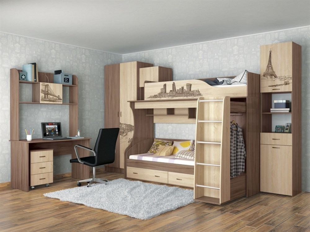 - Широкий выбор модулей: функциональная кровать-чердак, письменный стол, вместительные шкафы;