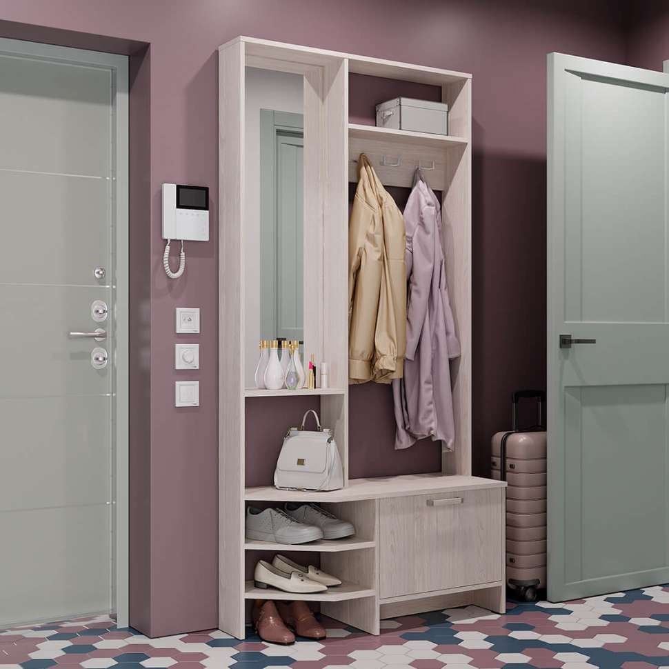 Компактная прихожая Тео – готовое решение для современной малогабаритной прихожей. Здесь есть все составляющие – зеркало с полкой для разных полезных мелочей, верхняя полка для головных уборов, просторная зона с крючками для верхней одежды, нижние открытые и закрытые полки, в которых можно хранить сезонную обувь. Регулируемые опоры позволяют установить прихожую на любой неровной поверхности.