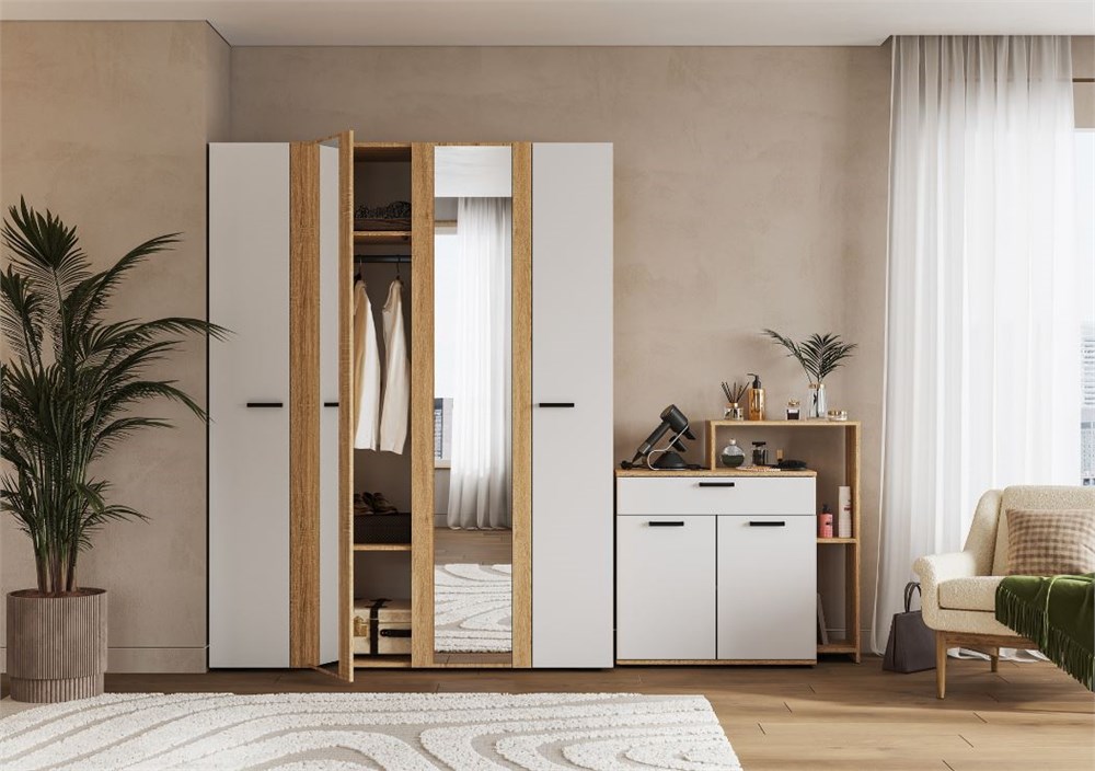 Четырехстворчатый шкаф с зеркалом ШК 04 Санса - универсальное и вместительное решение для хранения, подходящее как для спальни и гардеробной, так и для прихожей или гостиной. Внутри предусмотрено все необходимое: отделение со штангой для верхней и повседневной одежды, множество полок для белья, аксессуаров и других вещей, а также простороные ниши в нижней части. Зеркальные фасады визуально увеличивают пространство, а современное сочетание белого цвета и текстуры светлого дерева легко вписывается в любой интерьер.