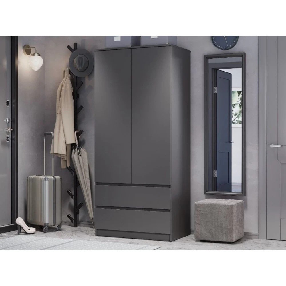 В двух выдвижных ящиках удобно хранить обувь или белье. За распашными дверцами размещена штанга для хранения верхней одежды.