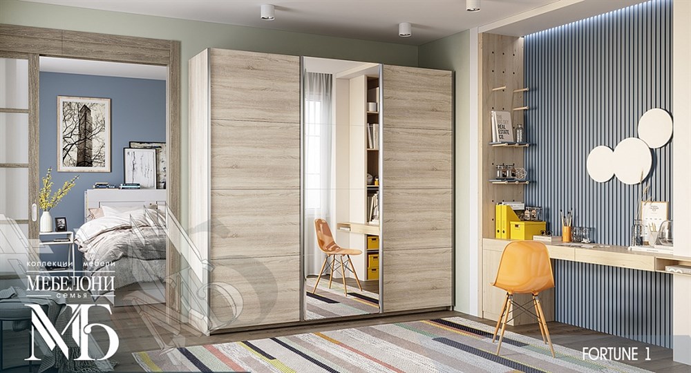 "Fortune 1" – это классический древесный декор в теплых мягких оттенках, дополненный зеркальными панелями во всю величину створки. Шкаф-купе «Fortune 1» вместит все Ваши любимые вещи и позволит покрасоваться собой во весь рост перед выходом в свет.