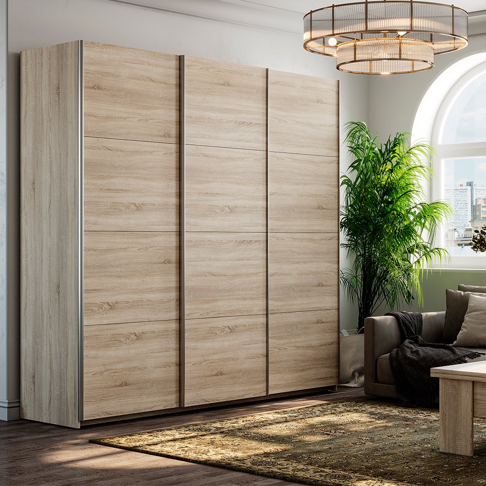 "Fortune 15" – створки шкафа-купе полностью выполнены из декора дуб сонома. Это придает помещению грациозность и аристократичность благодаря чистоте восприятия древесного декора.