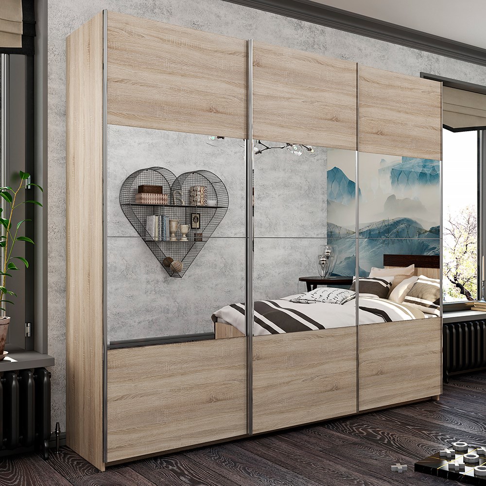 Фасады "Fortune 3" выполнены из ЛДСП в цвете дуб сонома. По центру створки украшены зеркалами, позволяющими полюбоваться собой. Так же зеркальные панели визуально увеличивают пространство и добавляют света.