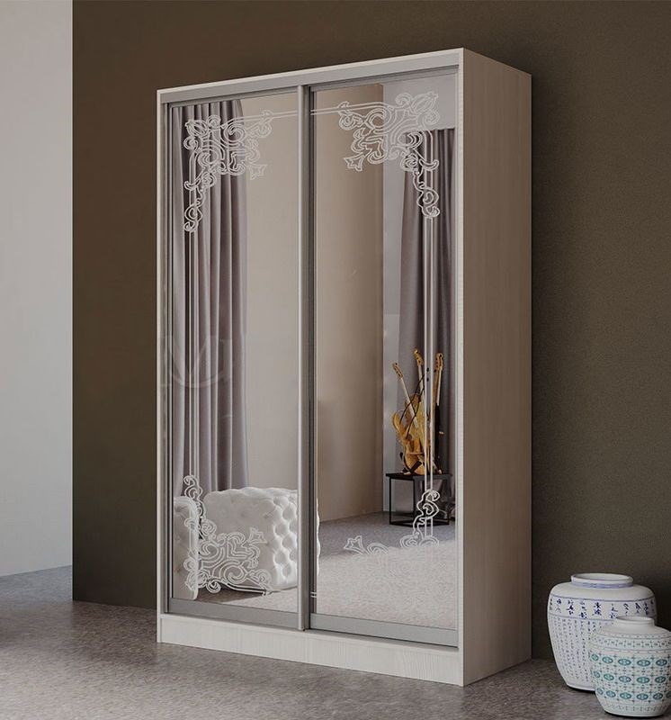 Двухстворчатый зеркальный шкаф с нежным рисунком добавит романтизма вашему интерьеру и выполнит задачу по хранению нужных вам вещей.