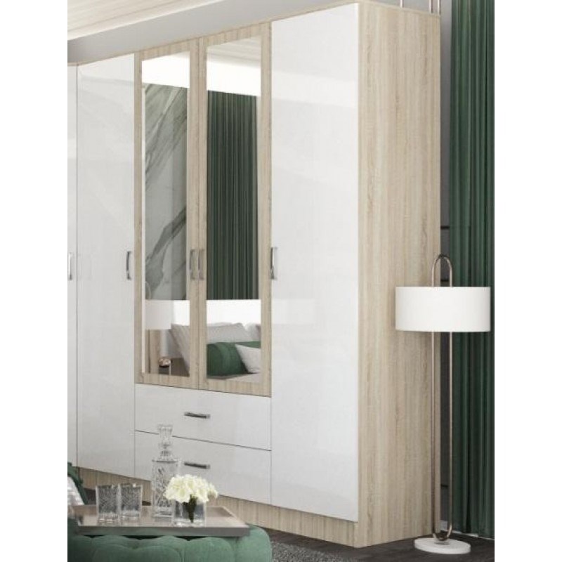 Центральная секция с двумя створками — для развешивания плечиков с одеждой на деревянной штанге и хранения аксессуаров на антресольной полке. Снаружи на каждой створке по зеркалу.