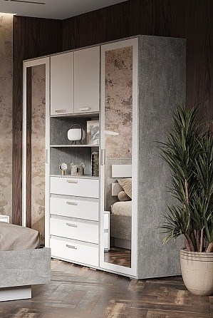 Необычная стильная модель - идеальное решение для создания современного интерьера. Шкаф оснащен полочками, ящиками и штангой. Корпус шкафа и двери выполнены в контрастных цветах и сдержанном индустриальном декоре. Две боковые створки шкафа украшены массивными зеркальными панелями.