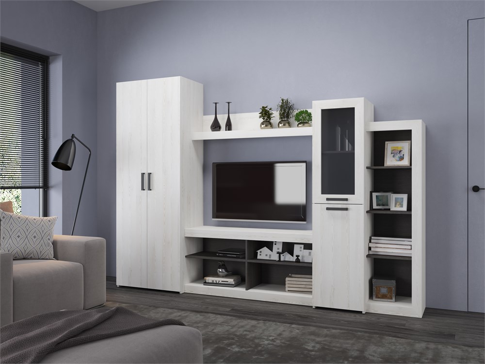 Вместительная стенка для небольших помещений. В гостиной «Oskar-4» предусмотрено: пенал, со стеклянной и глухой дверью, пристройка с открытыми полками, для хранения мелочей, бумаг, книг. Место для телевизора и аппаратуры. Полка для сувениров и фотографий. Плательный шкаф для хранения вещей на выдвижной штанге и на полках. За счет уменьшения высоты у пенала и пристройки, стенка имеет более облегченный вид.