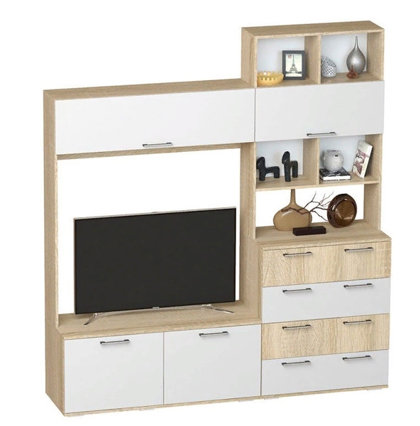 ЦС-03 - центральная секция. Функционал: 5 полок, 4 выкатных ящика, зона под ТВ, два отделения под ТВ зоной и два ящика на кронштейнах. Гостиная имеет нишу под ТВ размерами 1186х1044х460мм.