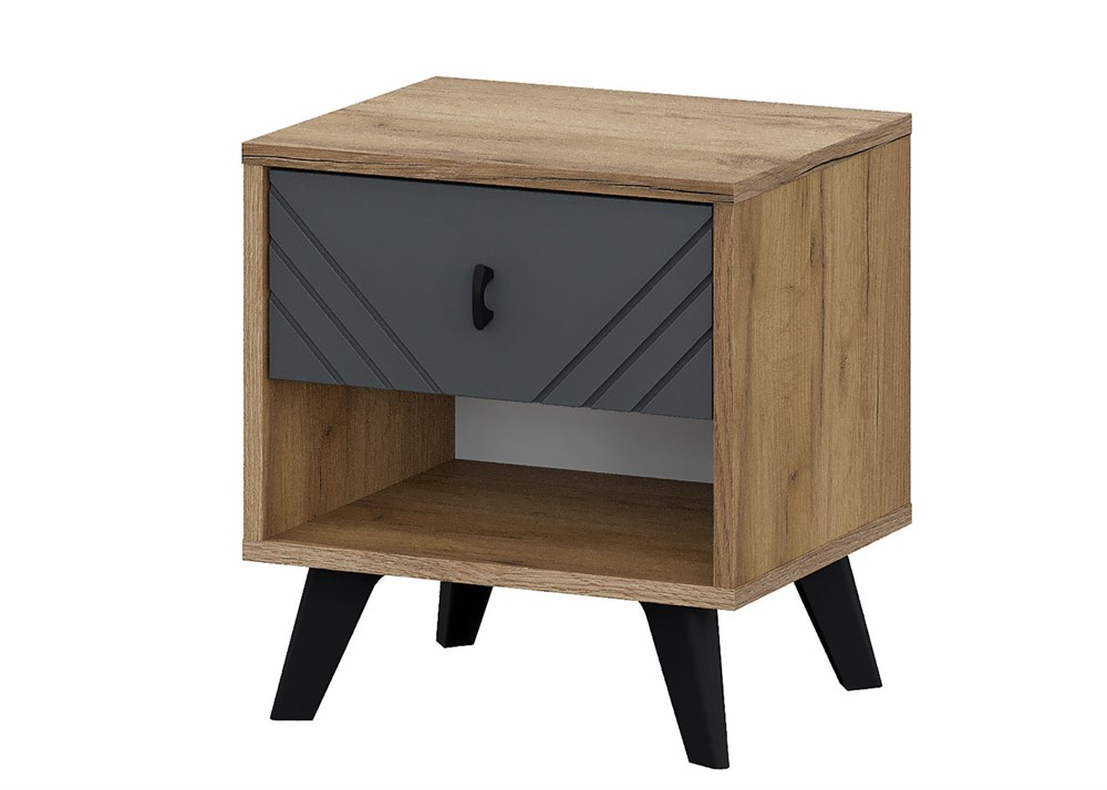 Прикроватная тумба из коллекции «Байкал» сочетает стиль и функциональность. Выдвижной ящик с фрезерованным фасадом из графитового МДФ оснащён шариковыми направляющими полного выдвижения и чёрной пластиковой ручкой. Ниже расположен открытый отсек для хранения. Четыре высокие пластиковые ножки делают тумбу визуально лёгкой и удобной в уходе, включая уборку с помощью робота-пылесоса.